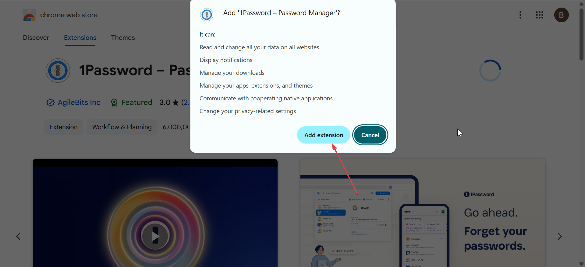 Nella pagina Chrome Web Store, fai clic su Aggiungi a Chrome ed esamina la finestra di richiesta di autorizzazione. Queste autorizzazioni consentono all’estensione di compilare le password e rilevare i campi di accesso.
