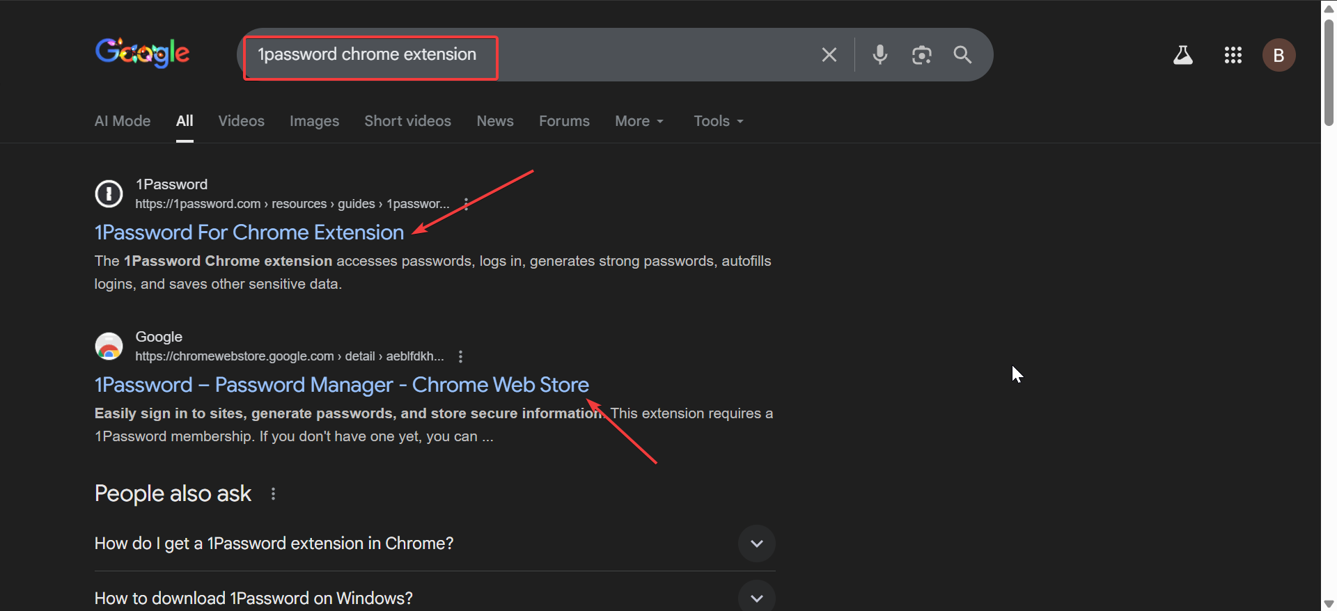 Apri una nuova scheda e cerca l’estensione 1Password per Chrome su Google. Seleziona il collegamento originale del Chrome Web Store per evitare cloni di phishing. In alternativa, puoi andare al sito web ufficiale di 1Password e cercare il collegamento per scaricare l’estensione.