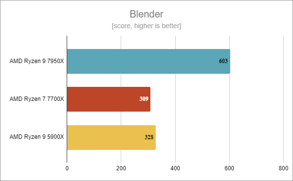 In Blender , l’AMD Ryzen 7700X ha ottenuto 309 punti, che è quasi esattamente la metà di quello che ho ottenuto con il Ryzen 9 7950X, ma lo è anche il suo numero di core/thread. E rispetto all’AMD Ryzen 9 5900X, che viene fornito con 12 core e 24 thread, l’octa-core 7700X offre quasi gli stessi livelli di prestazioni!