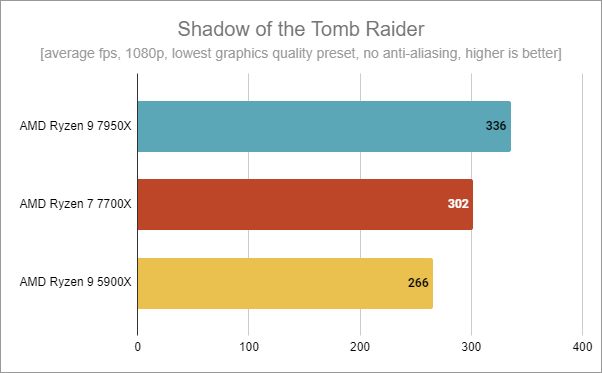 In Shadow of the Tomb Raider, utilizzando l’AMD Ryzen 7 7700X, ho misurato un framerate di 302 fps. È un risultato sorprendente, che mostra che questa CPU è migliore del 13% rispetto al Ryzen 9 5900X. Tuttavia, con il Ryzen 9 7950X, ho visto un aumento dell’11% dei frame al secondo (fps) rispetto al Ryzen 7 7700X.