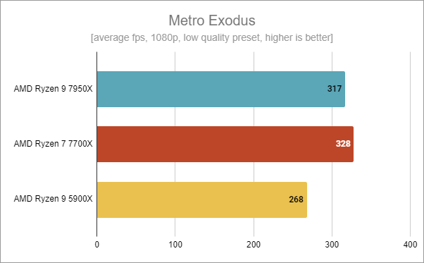 In Metro Exodus, uno dei giochi più impegnativi di sempre, ho misurato un framerate di 328 fps. È più di quello che ho ottenuto con il Ryzen 9 7950X di livello premium!