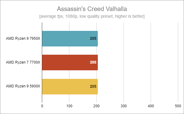 Ultimo ma non meno importante, Assassin’s Creed Valhalla, uno dei giochi con il requisiti di sistema più elevati in questi giorni. Sfortunatamente, c’è stato sicuramente un collo di bottiglia della GPU in questo gioco, poiché tutti e tre i processori si sono fermati esattamente a 205 frame al secondo. Ma questo è ancora un numero molto alto che mostra che Ryzen 7 7700X è un processore eccezionale per i giochi.