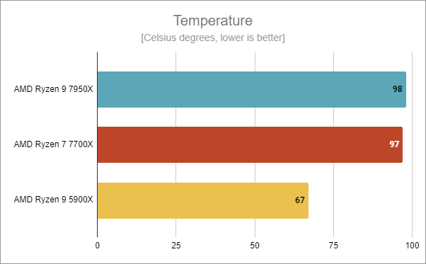 In termini di temperature, il numero più alto che abbia mai visto durante il benchmarking l’AMD Ryzen 7 7700X era di 97 gradi Celsius (~207 Fahrenheit). È piuttosto alto, ma il processore raggiunge questa temperatura solo brevemente e solo con carichi di lavoro estremamente impegnativi.