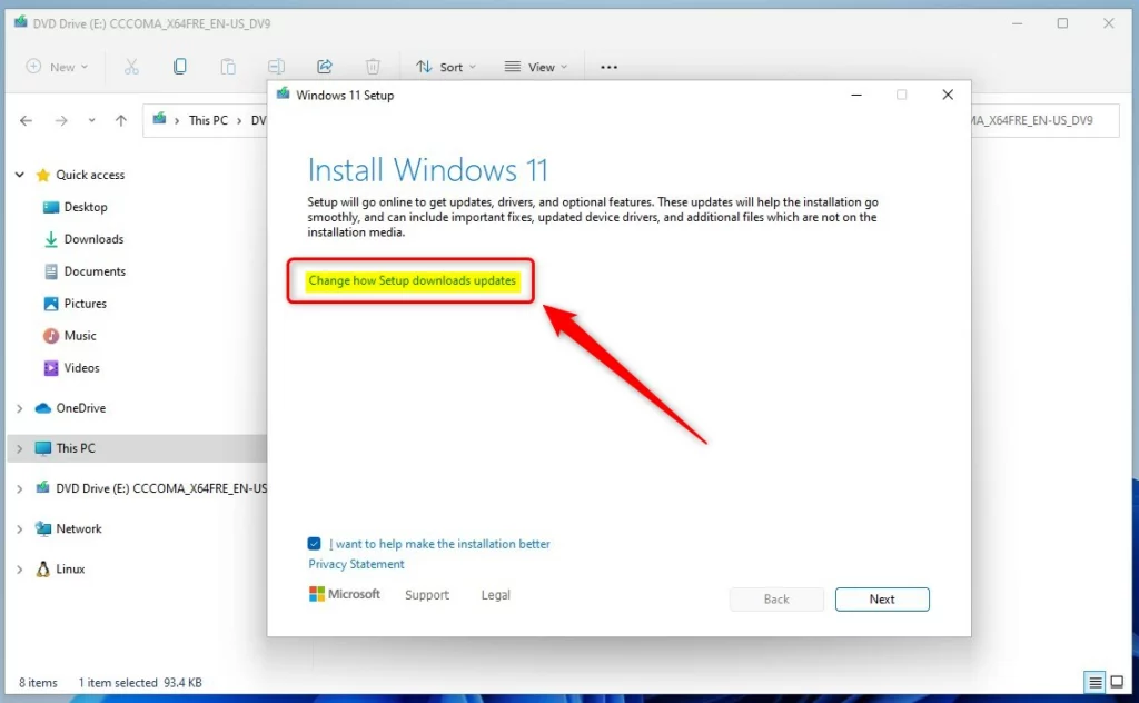 Nella finestra di installazione di Windows 11, sotto Installa Windows 11, fai clic sul link che dice”Cambia la modalità di download dell’installazione aggiornamenti“come evidenziato di seguito.