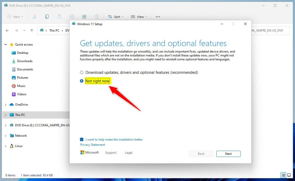 Nella finestra successiva, scegli Non adesso in modo da non scarica aggiornamenti, driver e funzionalità opzionali.