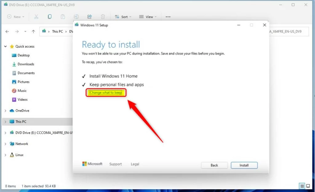 Nella finestra Pronto per l’installazione, fai clic sul link”Cambia cosa conservare“come evidenziato di seguito.