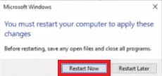 Ora, premi il Riavvia ora l’opzione per consentire alle modifiche di riflettere.