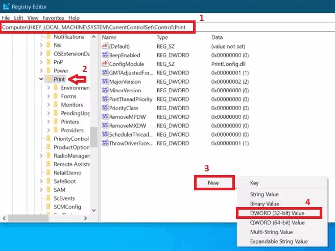 Ora premi il tasto Invio Si aprirà la finestra del Registro di sistema Vai all’opzione”Computer\HKEY_LOCAL_MACHINE\SYSTEM\CurrentControlSet\Control\Print”Fai clic con il pulsante destro del mouse su lo spazio vuoto della finestra e vedrai un menu a tendina. Naviga fino a”Valore DWORD (32-bit)”, si aprirà un altro menu e premi il pulsante”Nuovo”.