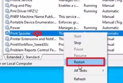 In Servizi, vedrai un lungo elenco di Servizi. Passa allo spooler di stampa tramite la sua funzione di ricerca. Fai clic con il pulsante destro del mouse sull’opzione”Spooler di stampa”. Apparirà un menu a tendina; vai a Riavvia.