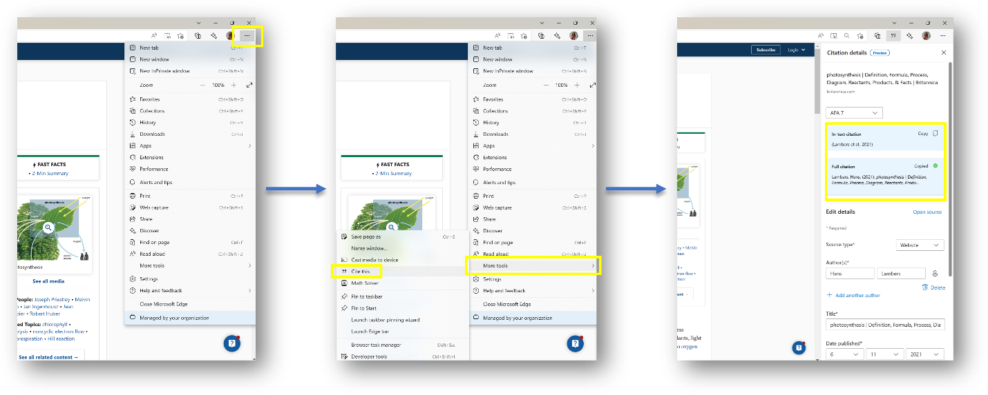 Gli studenti possono accedere alle citazioni in Microsoft Edge aprendo il menu a 3 punti → Altri strumenti → Cita questo.