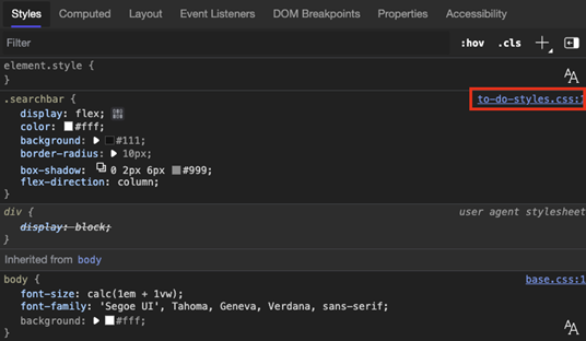 Puoi accedervi facendo clic sui collegamenti al file CSS stesso, che ti porta allo strumento Sorgenti e lontano dall’editor degli stili.