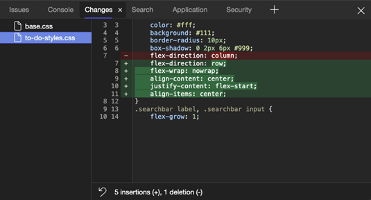 Gli strumenti per sviluppatori del browser hanno una funzionalità che aiuta con questo chiamata Modifiche che non viene molto utilizzata ed è in gran parte sconosciuta. Puoi accedervi dal menu dei comandi o dal menu contestuale e ti mostra una vista differenziale di tutti i file che hai modificato in questa sessione. Puoi utilizzare questo strumento per copiare e incollare nuovamente le modifiche nei file di origine.