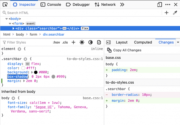 Firefox utilizza un approccio leggermente diverso di uno strumento per le modifiche che si aggiorna in tempo reale con le modifiche apportate. Crea anche un file CSS da copiare e incollare con commenti che spiegano in quali file incollare nuovamente queste modifiche e cosa è stato rimosso o aggiunto.