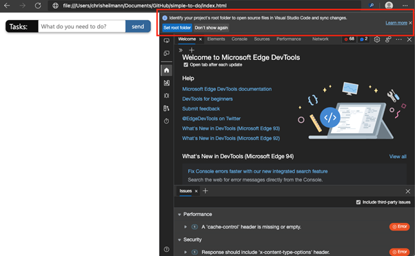 Una volta attivato questo e riavviato gli strumenti di sviluppo, navigando su un file sul disco rigido o sull’indirizzo di un server locale come localhost o 127.0.0.1 ti darà una richiesta che ti chiede di identificare la cartella principale di questo file. Puoi anche rinunciare a una sessione o non vedere mai questa opzione a guadagno.
