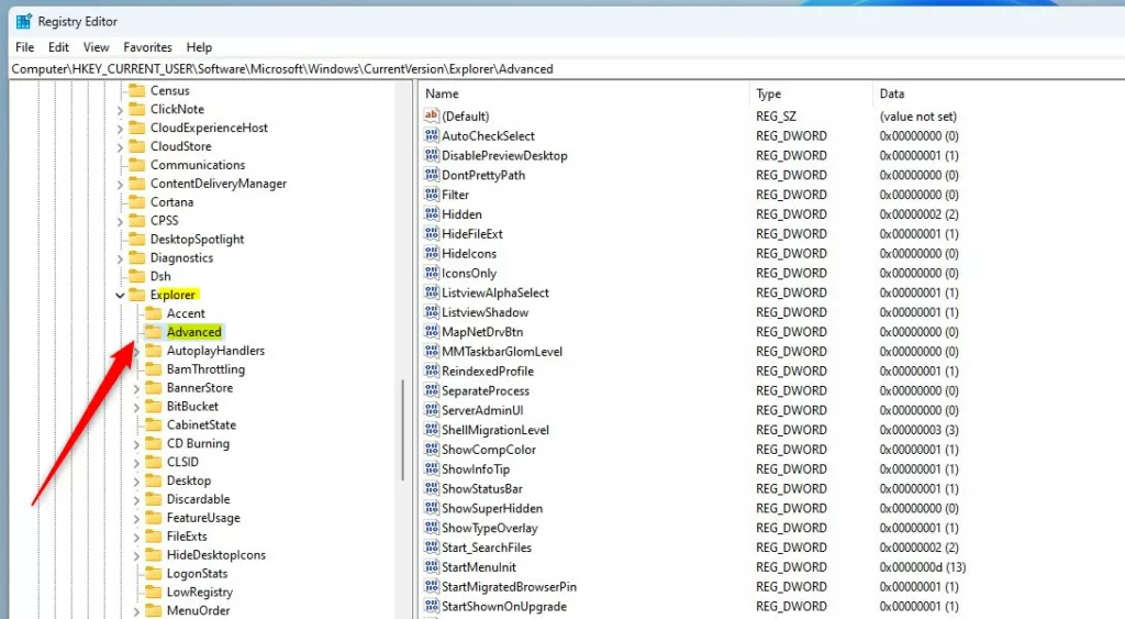 HKEY_CURRENT_USER\Software\Microsoft\Windows\CurrentVersion\Explorer\Advanced
