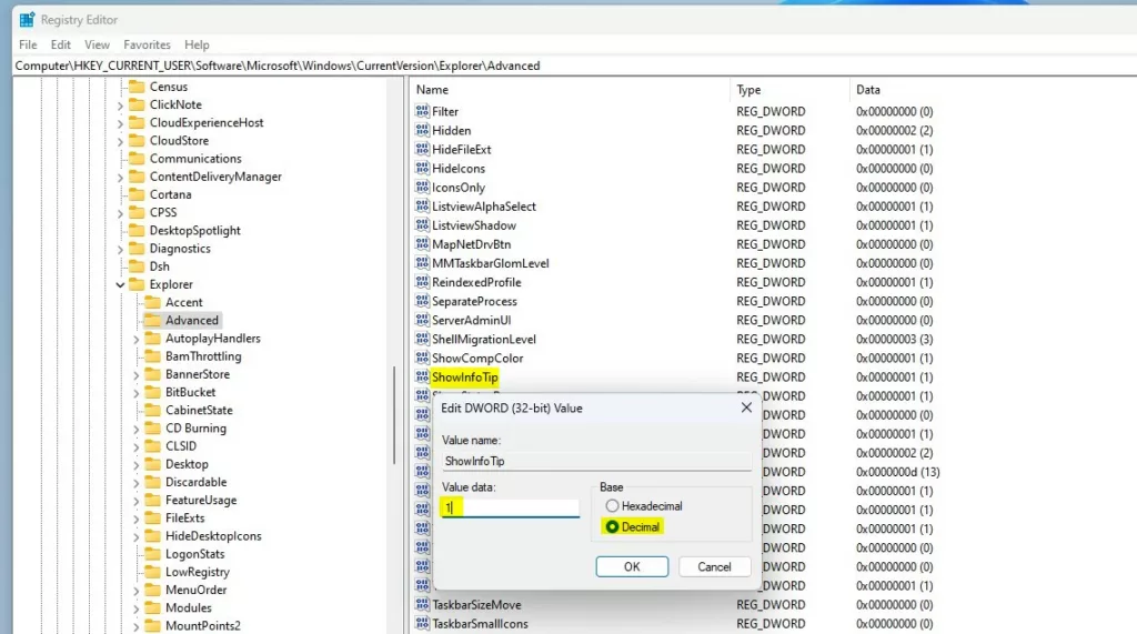 Fai doppio clic sul nome del nuovo valore (ShowInfoTip) e inserisci i Dati del valore di 1 per mostrare una descrizione popup per gli elementi della cartella e del desktop.