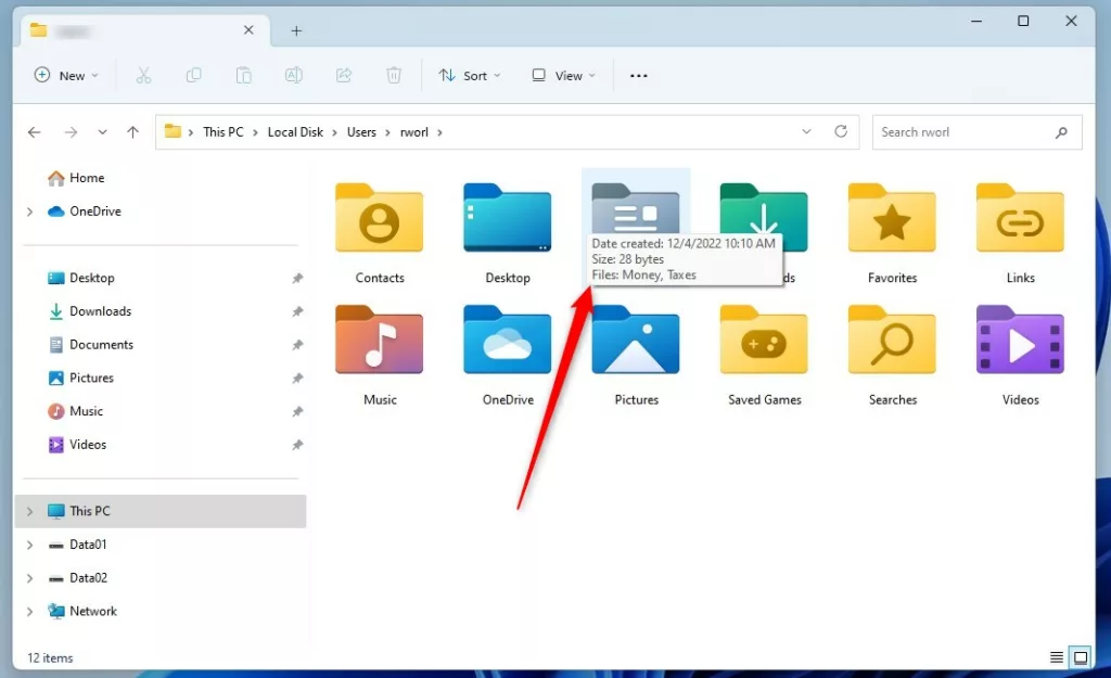 Come descritto in precedenza, Windows fornisce dettagli di proprietà di base come Data di creazione, Dimensioni, Cartelle e File all’interno delle cartelle quando passi il mouse sopra un elemento.