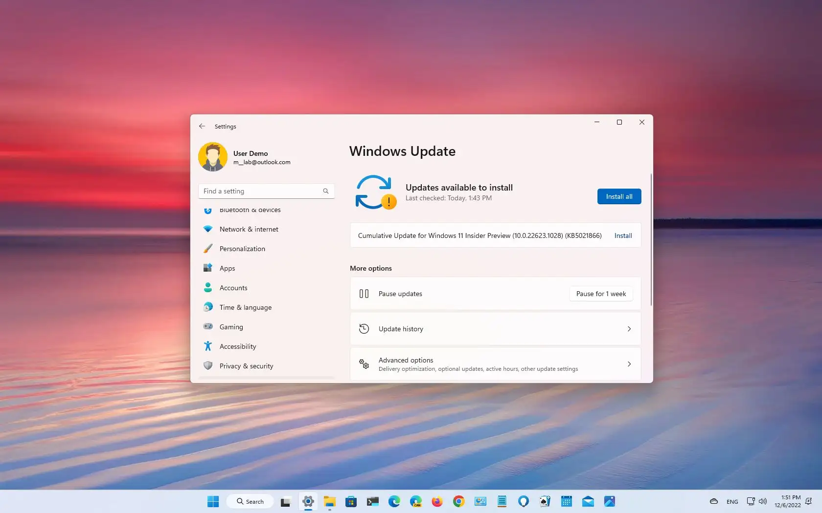 Dopo aver registrato il computer nel programma, puoi scaricare la build 22623.1028 dalle impostazioni di”Windows Update”facendo clic sul pulsante Controlla aggiornamenti. Tuttavia, per ricevere l’aggiornamento avrai bisogno di un dispositivo che soddisfi i requisiti minimi di sistema se sei un nuovo utente del programma Windows Insider. Se il dispositivo riceve la build 22621.1028, puoi verificare di nuovo la presenza di aggiornamenti per scaricare la build 22623.1028.