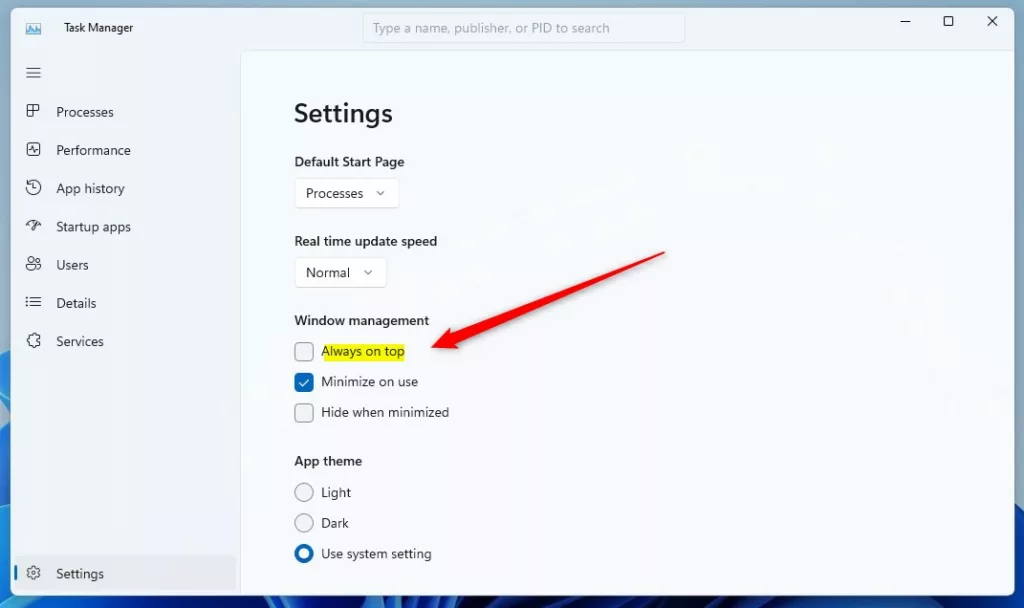 In Impostazioni riquadro, in Gestione di Windows, seleziona o deseleziona la casella accanto a”Sempre in primo piano“per abilitare o disabilitare l’app Task Manager sopra le altre finestre.