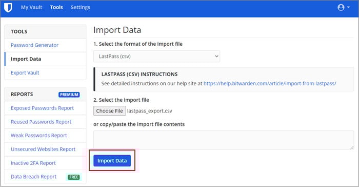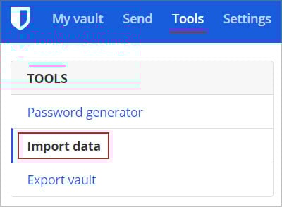 Accedi al tuo caveau di Bitwarden. Dalla barra di navigazione in alto, fai clic su Strumenti. Fai clic su Importa dati.