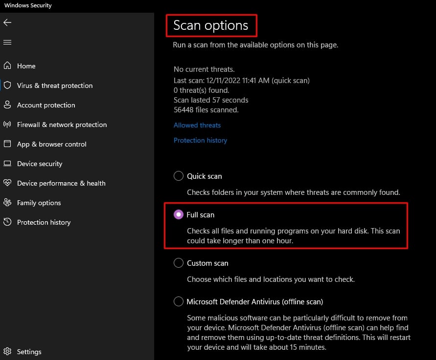 Vai a Opzioni di scansione e seleziona Scansione completa.