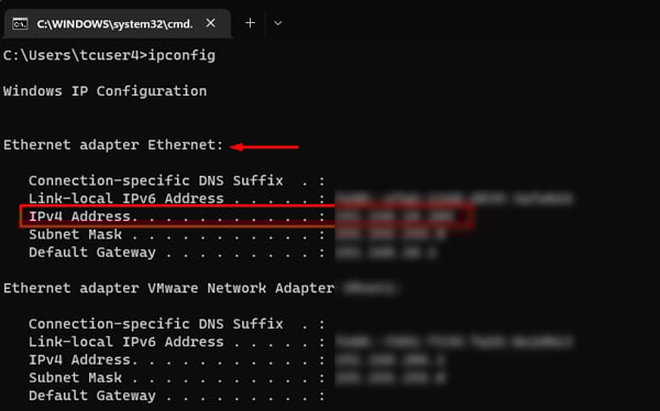 Apri la finestra di dialogo Esegui. Inserisci cmd per aprire il prompt dei comandi. Digita ipconfig e premi Invio. Cerca l’Indirizzo IPv4 della scheda di rete che stai utilizzando e prendi nota dell’IP.