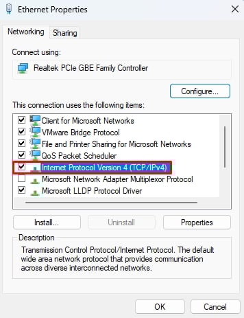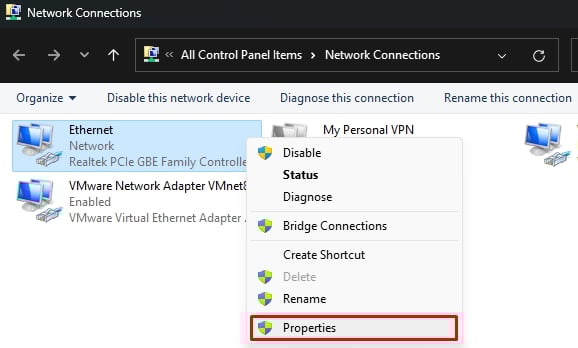 Premi Windows +”R”per aprire la finestra di dialogo Esegui. Digita ncpa.cpl e premi Invio. Fai clic con il pulsante destro del mouse sulla tua connessione e seleziona Proprietà.