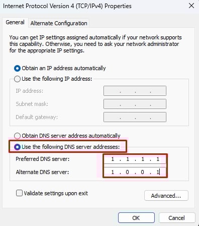 Seleziona la casella Utilizza i seguenti indirizzi server DNS. Inserisci l’indirizzo 1.1.1.1 come Server DNS preferito e 1.0.0.1 come Server DNS alternativo.