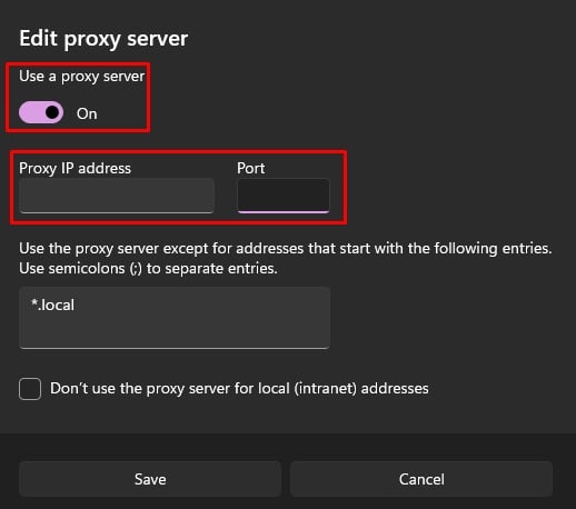 Attiva la barra di attivazione. Inserisci l’indirizzo IP e la porta del proxy.