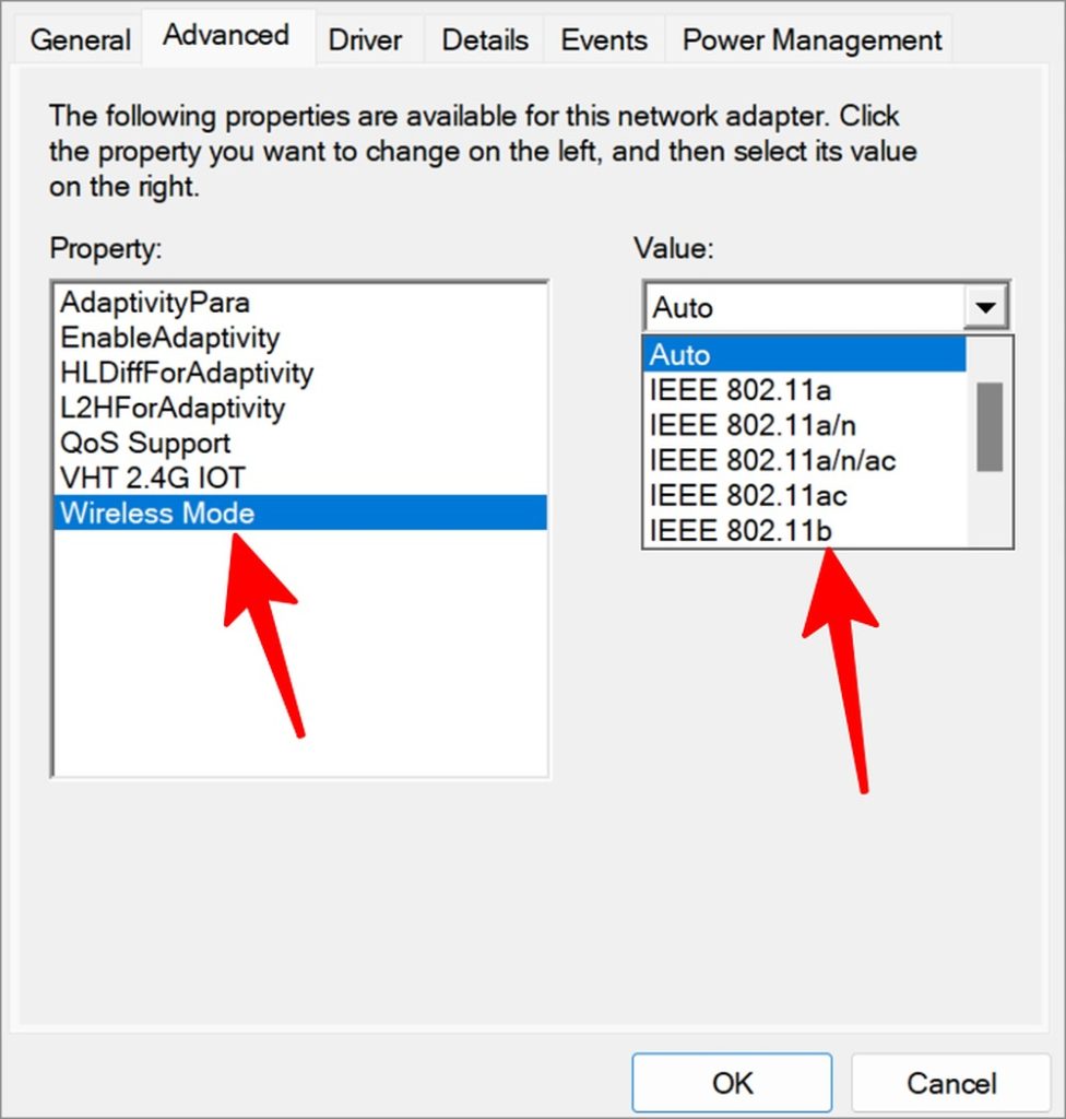 5. Seleziona Modalità wireless ed espandi il menu Valore.