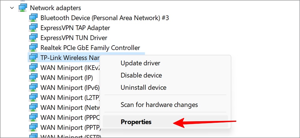 3. Fai clic con il pulsante destro del mouse sull’adattatore Wi-Fi e apri Proprietà. strong> dal menu contestuale.