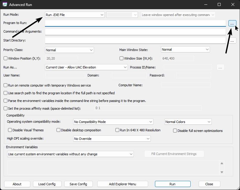 Dopo aver aperto l’applicazione, seleziona”Esegui file.EXE”dal menu a discesa”Modalità di esecuzione”.