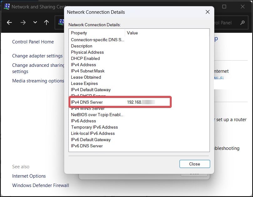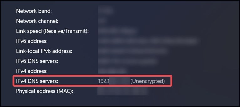Trova il server DNS IPv4 sotto i dettagli della connessione di rete.