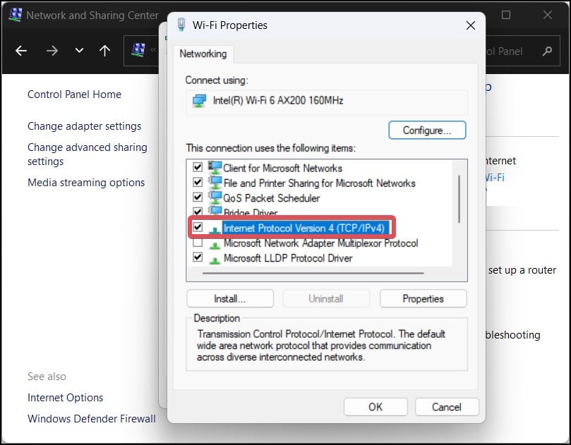 Sotto gli elementi di connessione, cerca Protocollo Internet versione 4 (TCP/IPv4).