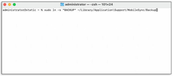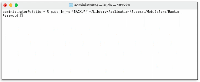 Digita”sudo ln-s “[target]”~/Library/Application\Support/MobileSync/Backup”senza le virgolette esterne. Sostituisci”[target]”con l’indirizzo della cartella in cui desideri archiviare i file di backup e premi “Invio.”