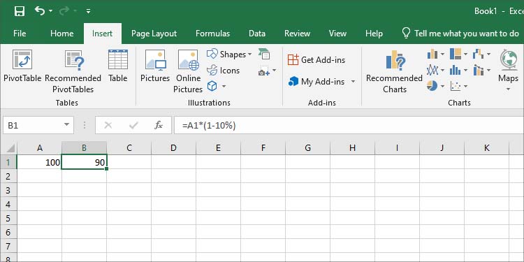 Ad esempio,=100*(1-10%) sottrarrà 10% da 100, che è 90. Puoi anche scambiare il valore numerico con un riferimento di cella contenente un numero.