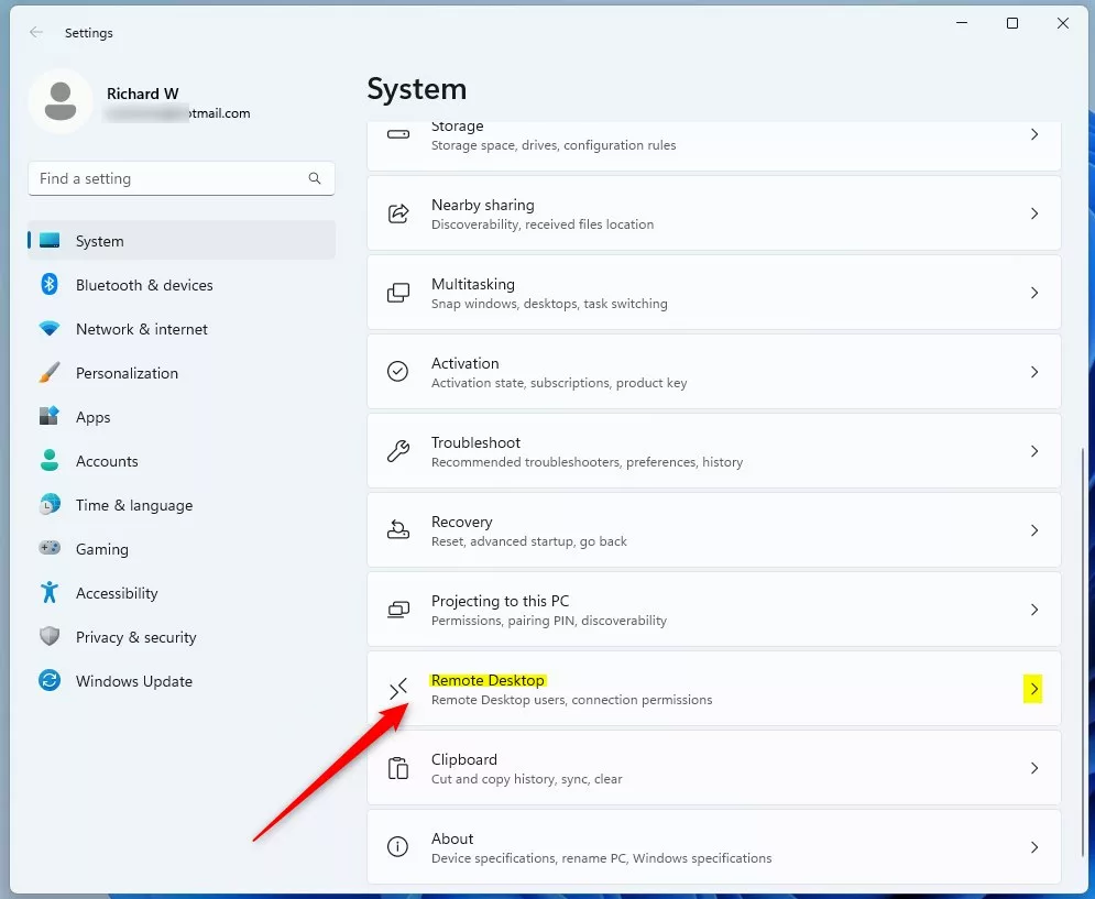 A destra, seleziona Desktop remoto riquadro da espandere.