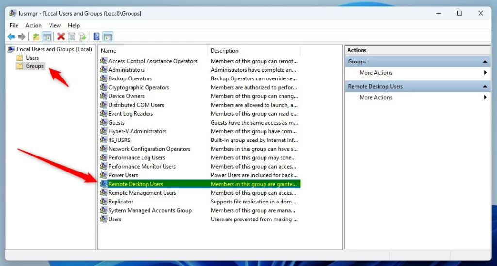 Quando si apre la console, seleziona Gruppi e fai clic sul gruppo Utenti desktop remoto per aprirlo.