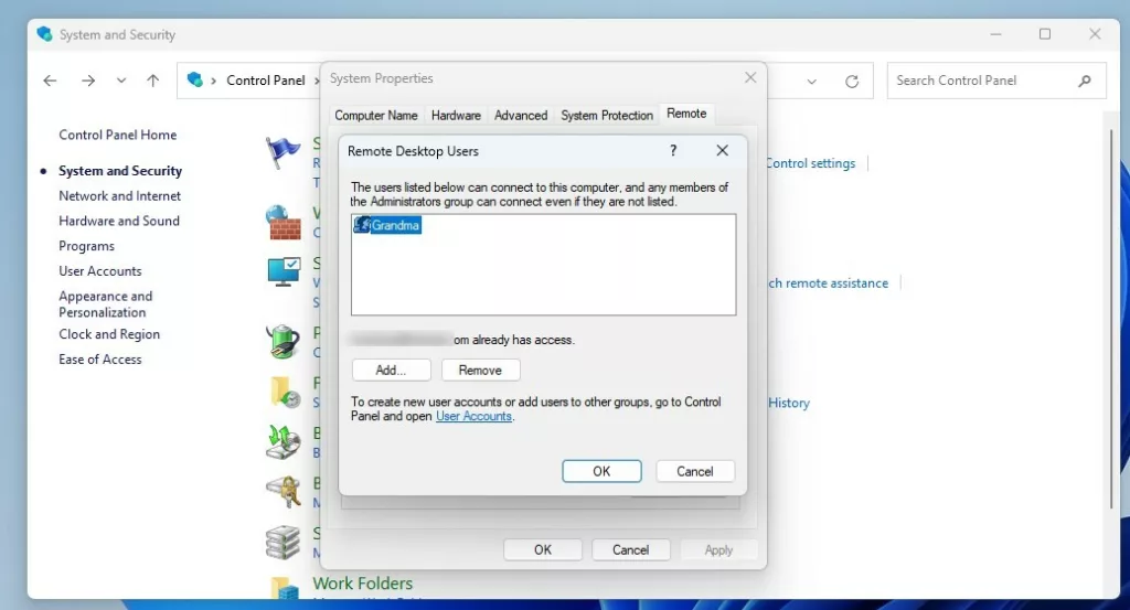 Aggiungi o rimuovi utenti di desktop remoto utilizzando il Pannello di controllo