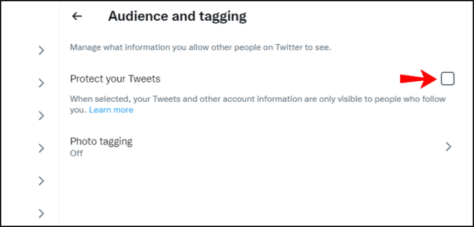 Controlla la sezione”Proteggi i tuoi Tweet”x sulla destra.