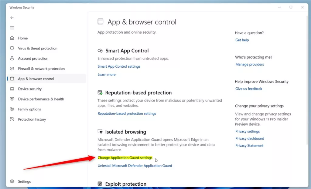 In Controllo di app e browser pagina delle impostazioni dell’app Sicurezza di Windows, in Navigazione isolata, fai clic sul link”Modifica impostazioni di Application Guard“.