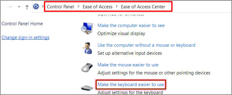 apri Esegui premendo Win + R. Digita control e premi Invio per aprire il Pannello di controllo. Vai a Centro accessibilità o Centro accessibilità > Centro accessibilità. Fai clic su Semplifica l’utilizzo della tastiera.