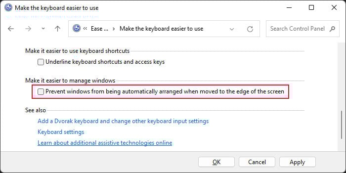 Deseleziona Impedisci la disposizione automatica delle finestre quando vengono spostate sul bordo dello schermo e fai clic su Applica > OK.