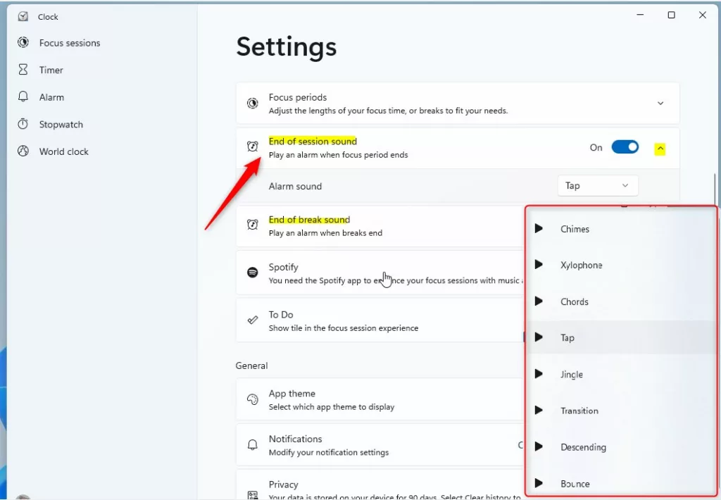 Nel riquadro Impostazioni orologio, seleziona sia il”Suono di fine pausa ‘e”Suono di fine pausa“. Espandi ogni riquadro e utilizza l’opzione a discesa per selezionare un Suono di allarme diverso.