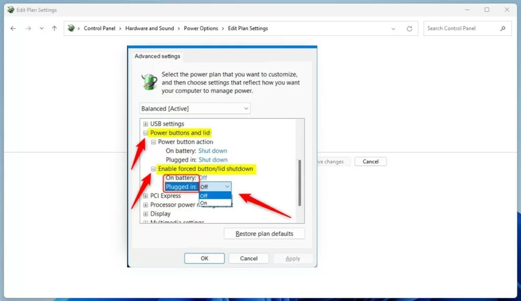 Di seguito è riportato come abilitare o disabilitare l’arresto forzato del pulsante/coperchio in Windows 11.