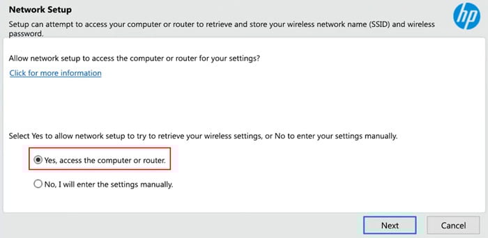 Se richiesto, connettiti alla stampante utilizzando il cavo USB e fai clic su Avanti. Seleziona Sì, accedi al computer o al router e fai clic su Avanti.