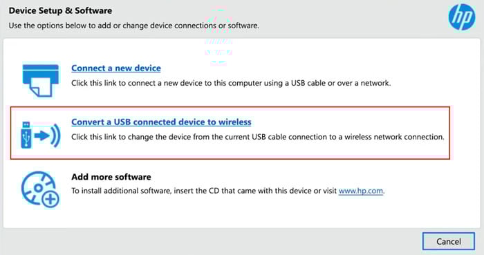 L’assistente stampante HP consente inoltre di convertire una connessione USB in wireless.