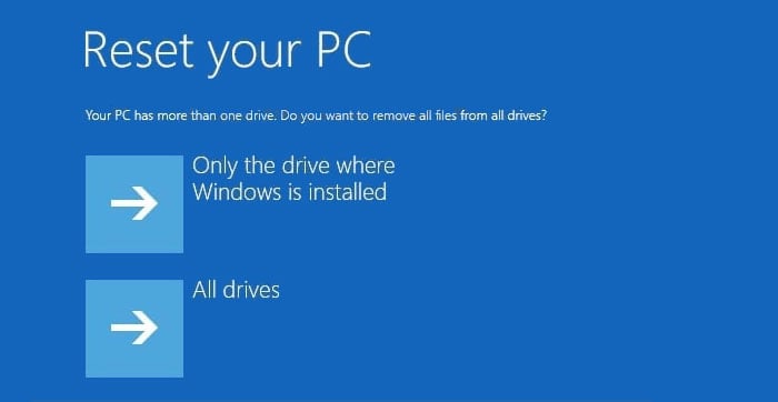 Per build precedenti, se la partizione di ripristino non esiste, è necessario inserire l’installazione di Windows o il supporto di ripristino. Se hai più di un sistema operativo, seleziona quello che desideri reimpostare. Scegli se cancellare l’unità Windows o Tutte le unità. (Solo se hai più di un disco)