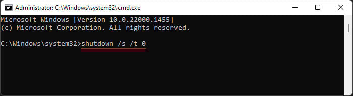 Premi Maiusc + F10 per aprire il prompt dei comandi. Digita shutdown/s/t 0 e premi Invio.