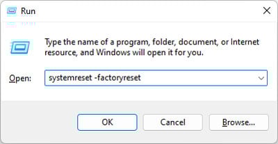 Apri Esegui. Digita systemreset-factoryreset e premi Invio per avviare il programma di ripristino del sistema.